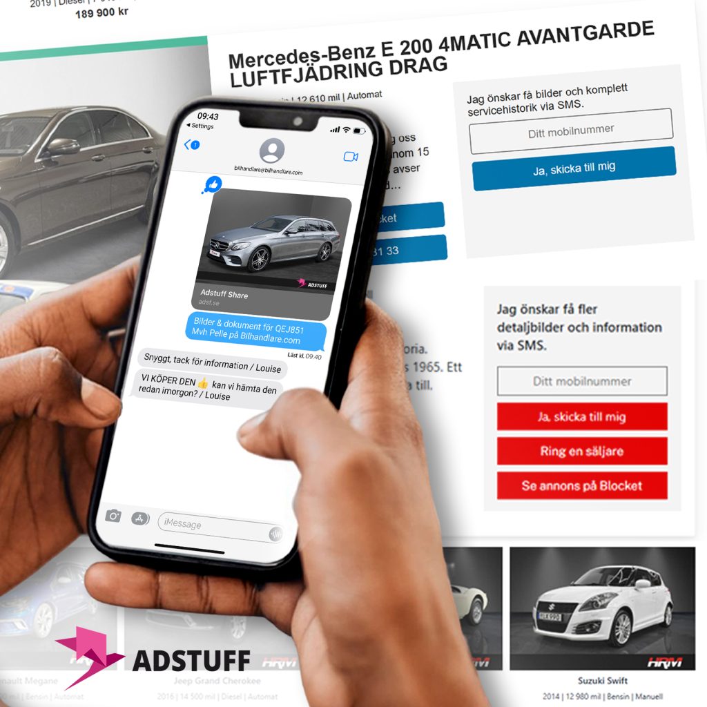Dela bilder och information enkelt via SMS, WhatsApp eller e-post, och behåll kunddialogen på din egen Adstuff-sida med ert CI och varumärke.